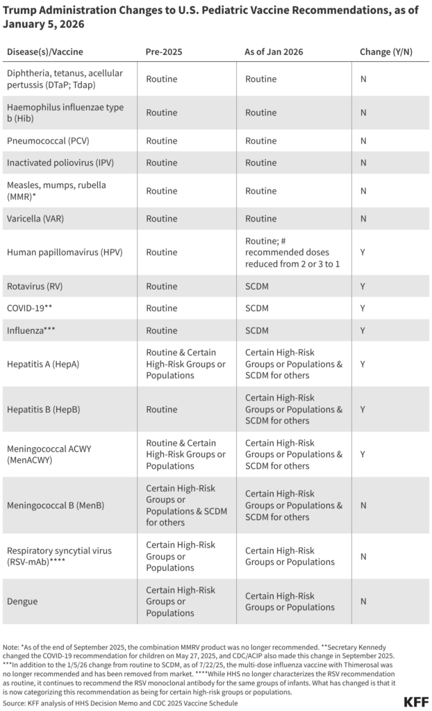 Starting in 2025, changes by HHS to routine vaccine recommendations for children have reduced the number of diseases targeted from 17 to 11 and the number of routine vaccines from 13 to 7 (see Table).